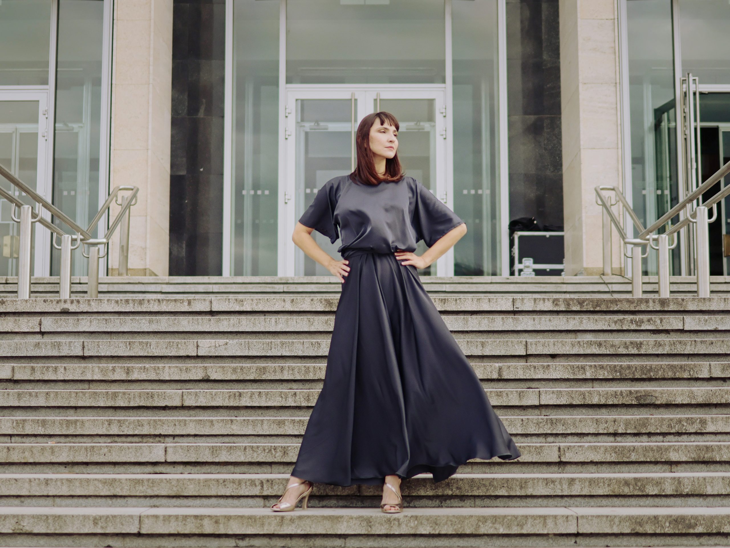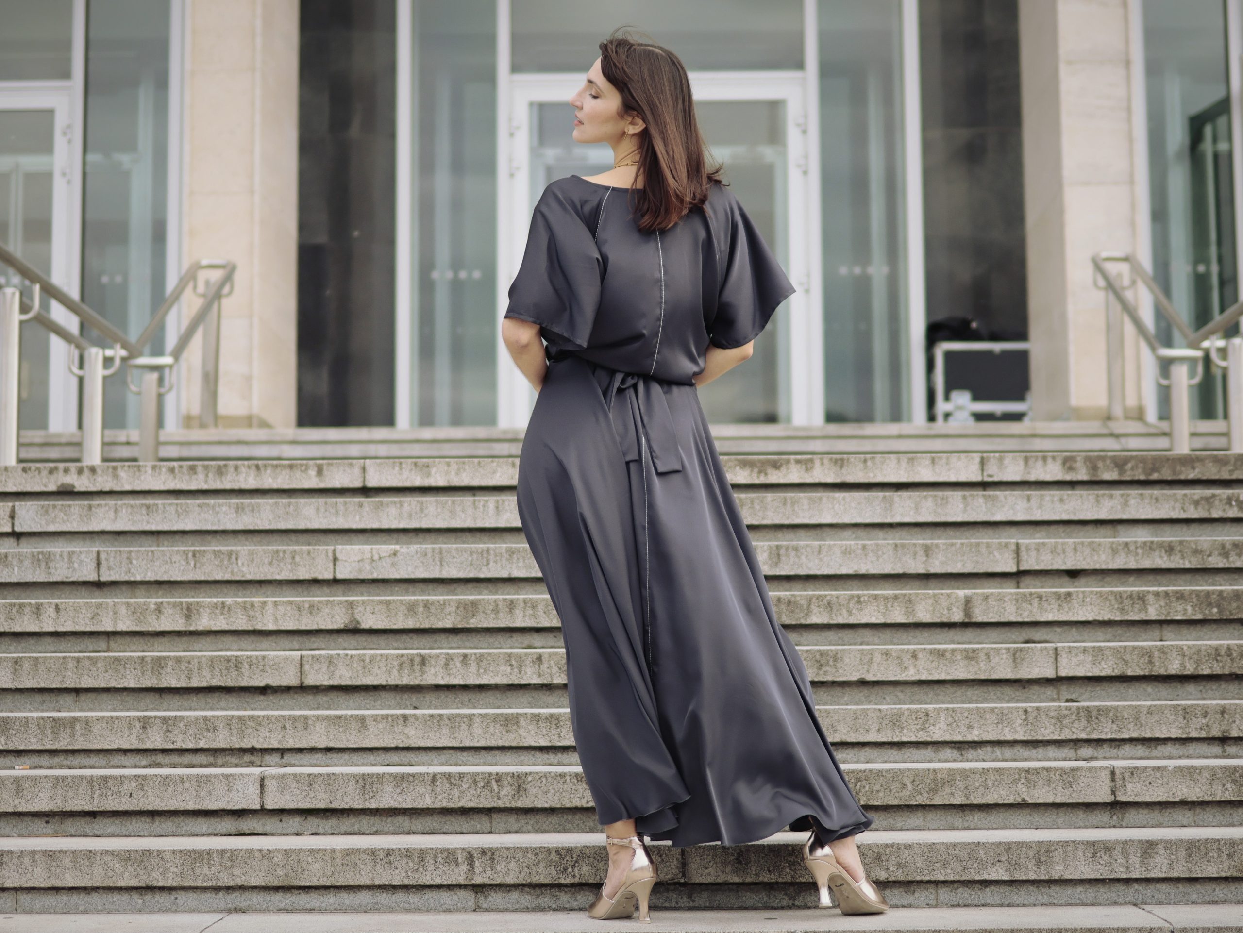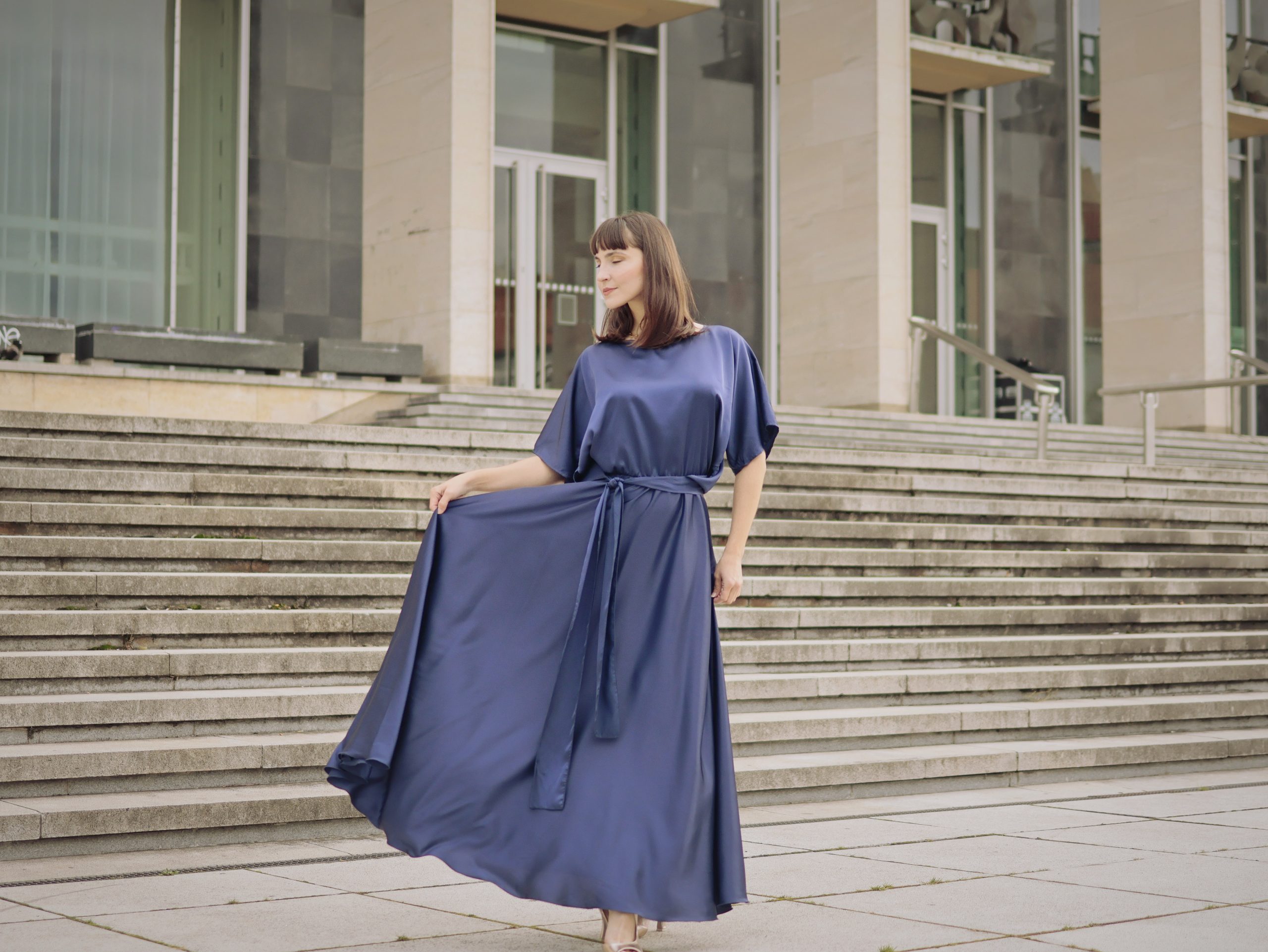 šaty dlouhé společenské s kolovou sukní, lodičkovým výstřihem a variabilní vázačkou v pase
