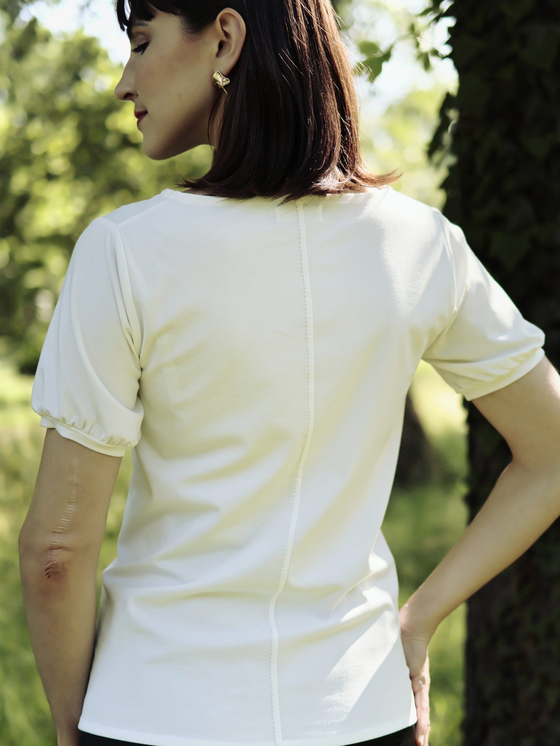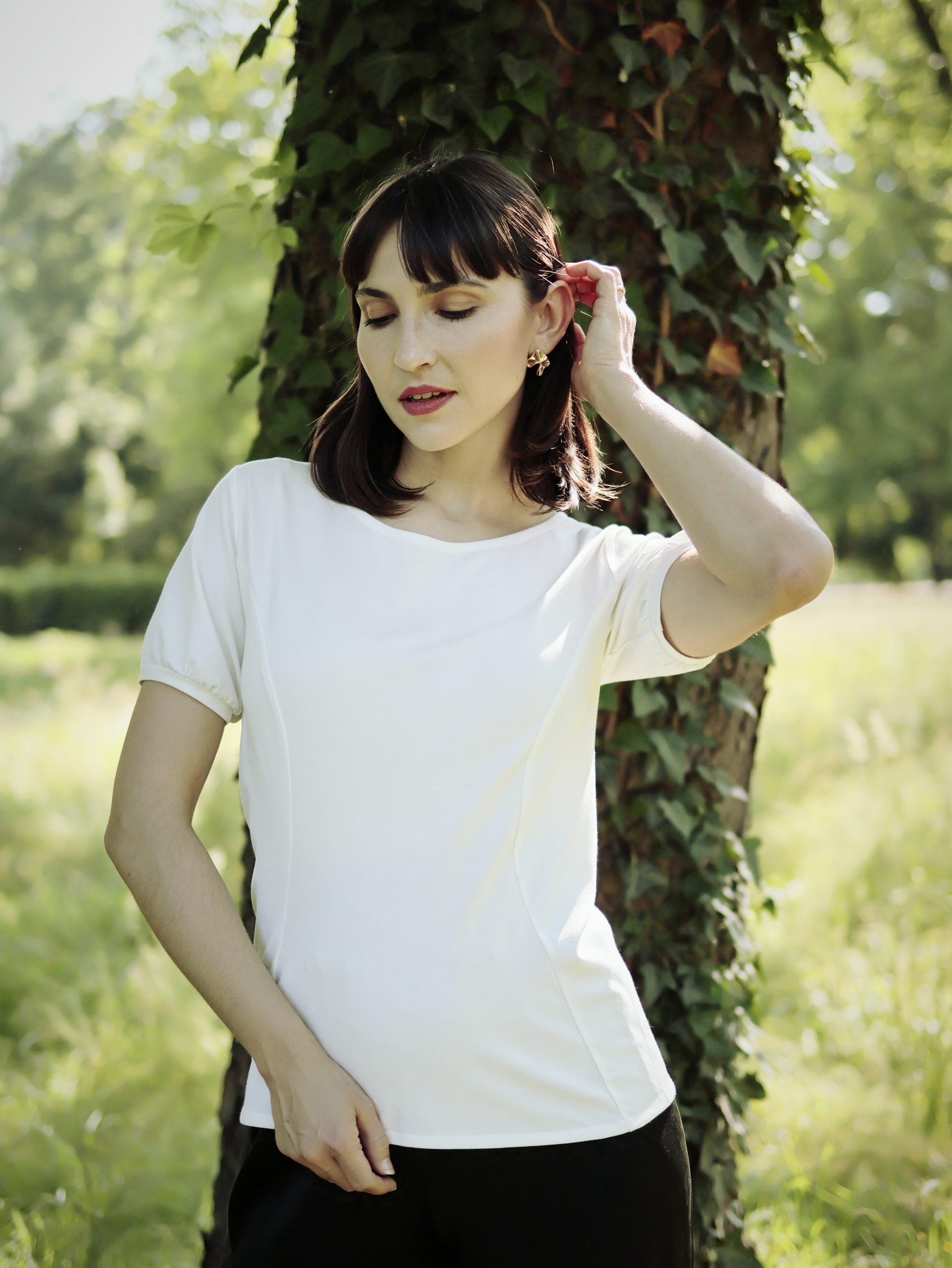 tričko z pohodlného směsového úpletu s pricesovými švy a zvýrazněným prošitím zad ve variantě s rukávkem